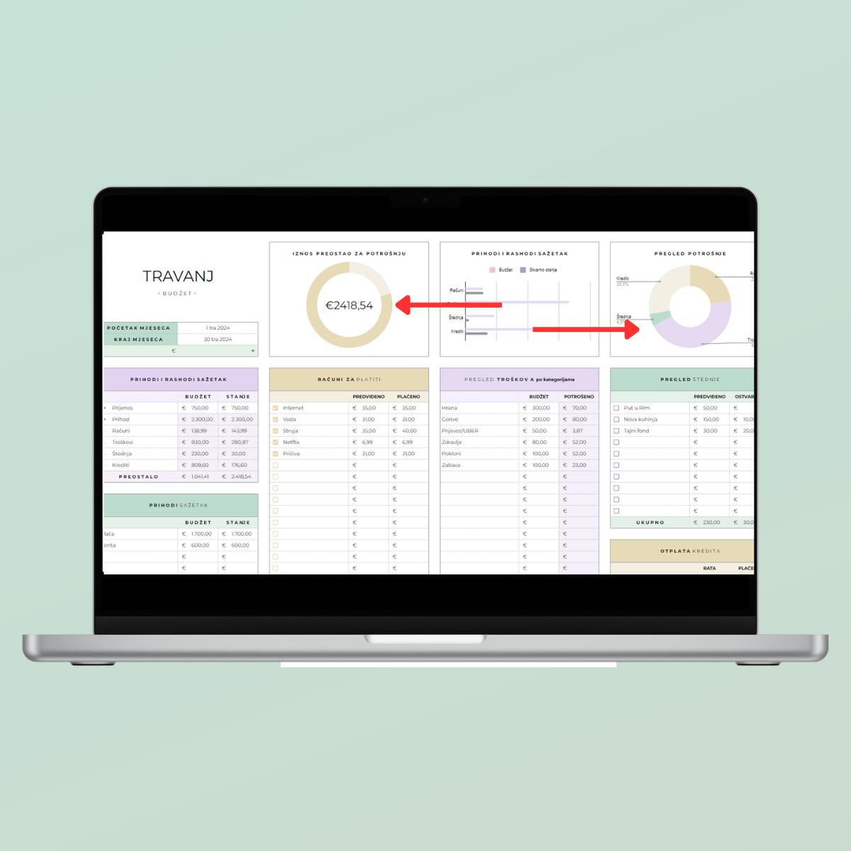 Vizualni prikaz prihoda i troškova je jedna od naših omiljenih prednosti ove tablice. Sve je kristalno jasno na prvi pogled.